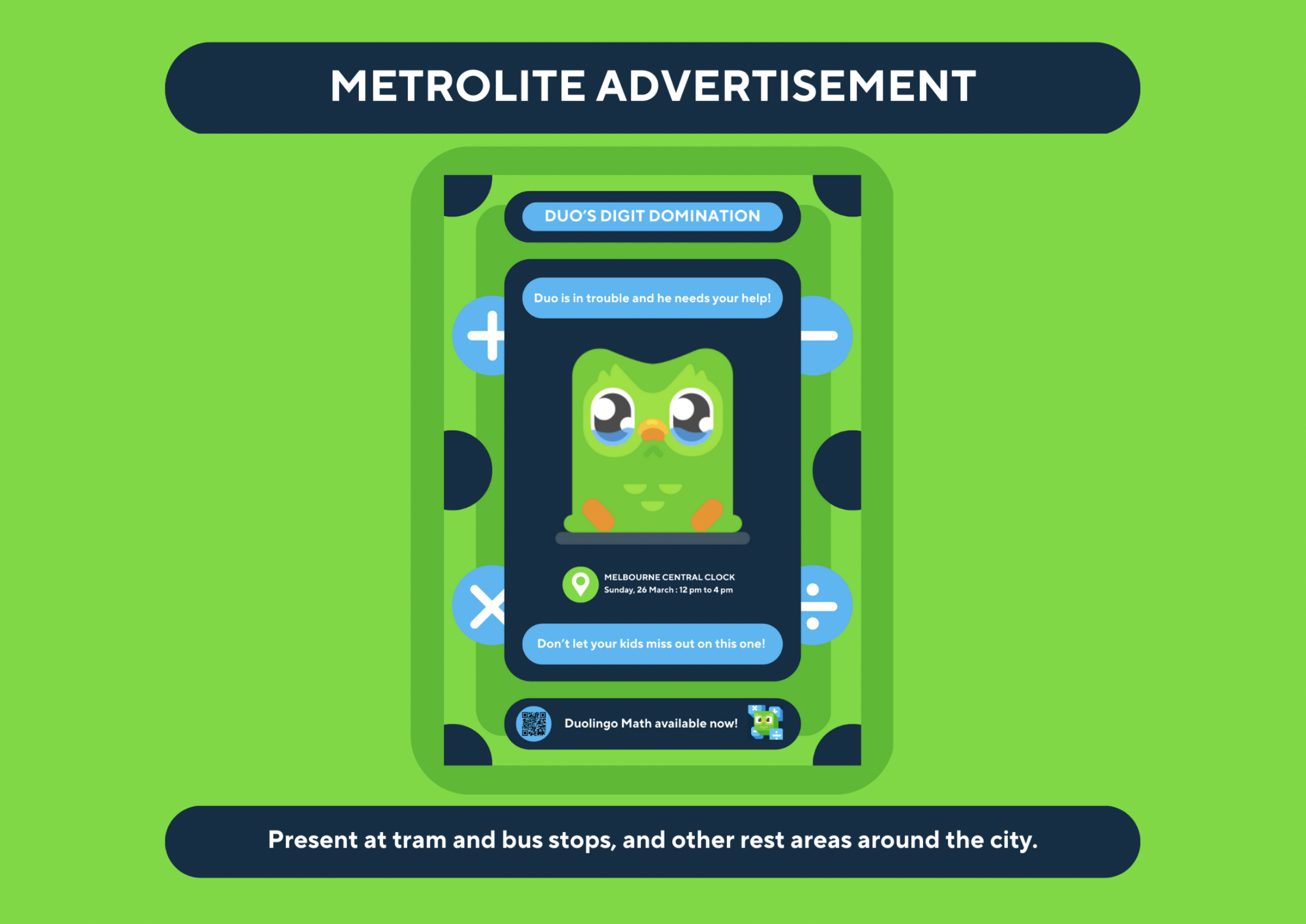 Interest and results among students in maths are rapidly falling. Many blame math itself, saying that it's not needed in the "real world". Duo Lingo Math wants to highlight that math is still relevant to our daily life and is fun. Through this case study, we intend to campaign to bring Duo Lingo Math into the real world and raise its awareness.